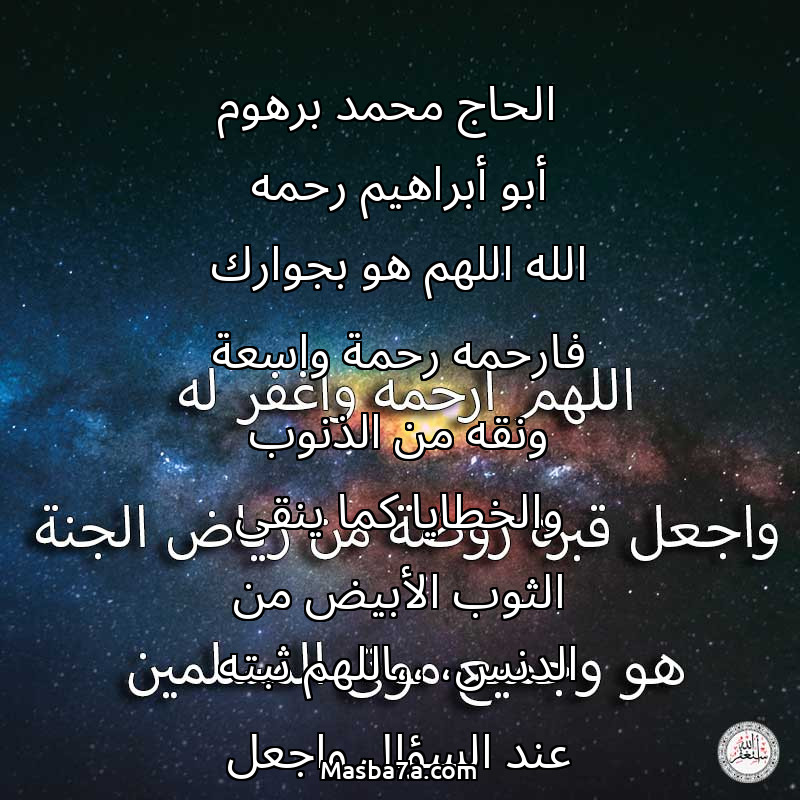 دعاء عن روح المرحوم الحاج محمد برهوم أبو أبراهيم رحمه الله اللهم هو بجوارك فارحمه رحمة واسعة ونقه من الذنوب والخطايا كما ينقى الثوب الأبيض من الدنس، ،،اللهم ثبته عند السؤال واجعل قبره روضة من رياض الجنة ووسع في مدخله واجعله ممن تقل لهم ادخلوها بسلام.