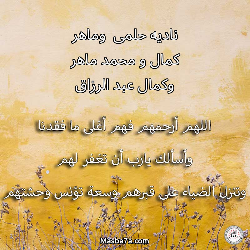 اللهم ارحم ( ناديه حلمى وماهر كمال و محمد ماهر وكمال عبد الرزاق ) وانس وحشتهم واجمعنا بهم في جنتك ، اللهم ارحمهم بقدر شوقنا لهم اللهم ارحمهم واغفر لهم.