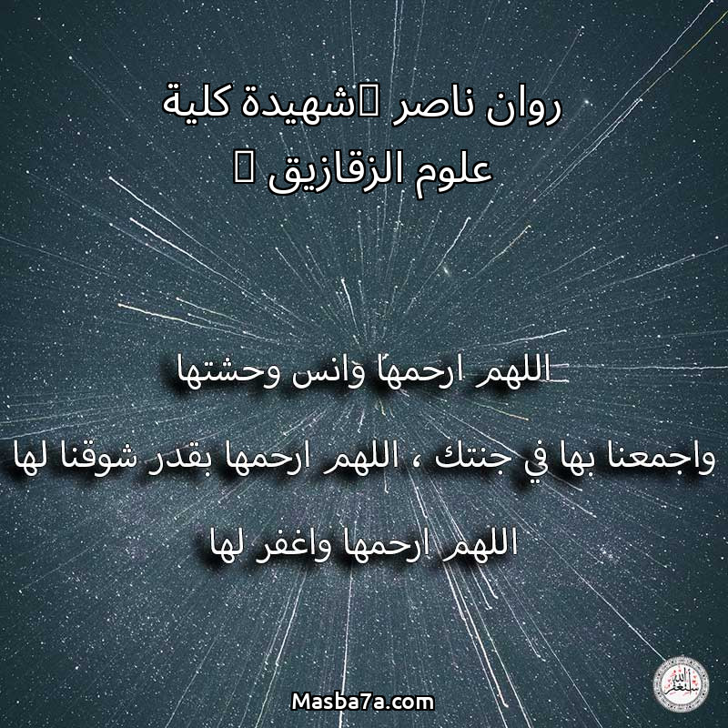 اللهم ارحم ( روان ناصر (شهيدة كلية علوم الزقازيق ) ) وانس وحشتها واجمعنا بها في جنتك ، اللهم ارحمها بقدر شوقنا لها اللهم ارحمها واغفر لها .