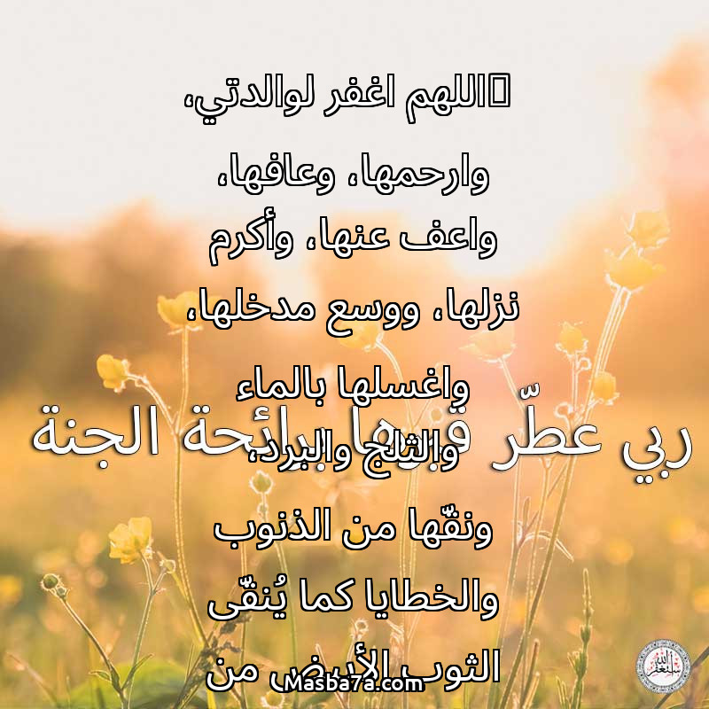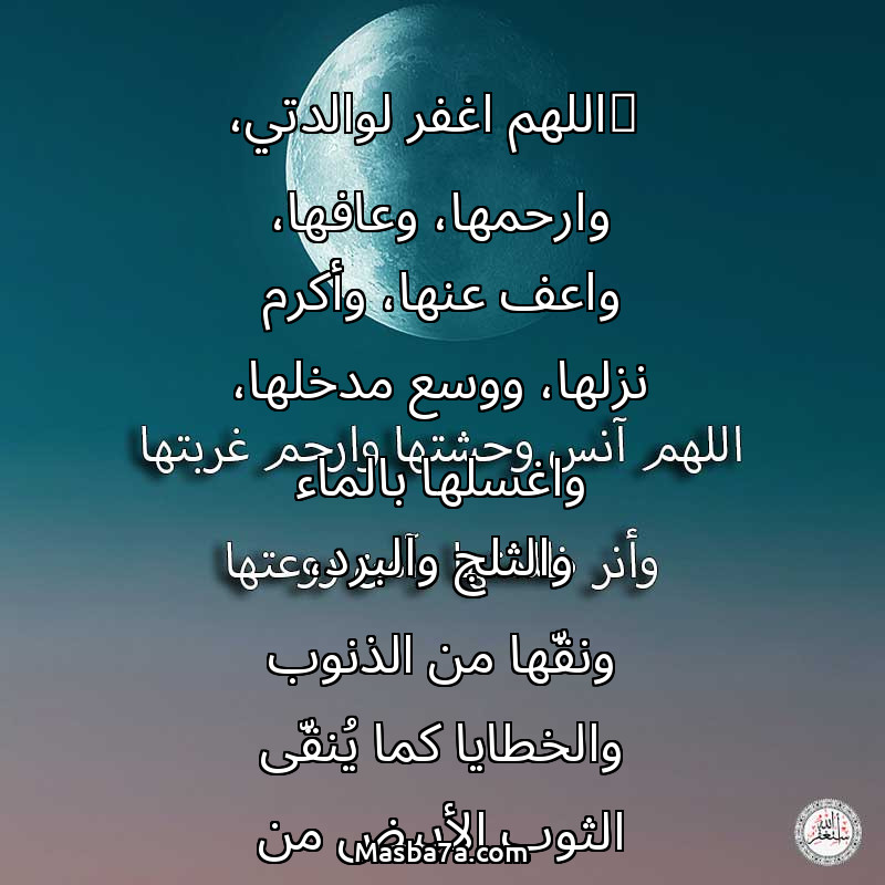 "اللهم اغفر لوالدتي، وارحمها، وعافها، واعف عنها، وأكرم نزلها، ووسع مدخلها، واغسلها بالماء والثلج والبرد، ونقّها من الذنوب والخطايا كما يُنقّى الثوب الأبيض من الدنس. اللهم اجعل قبرها روضة من رياض الجنة، ولا تجعله حفرة من حفر النار. اللهم اجزها عن الإحسان إحسانًا، وعن الإساءة عفوًا وغفرانًا. اللهم اجعلها من أهل الفردوس الأعلى، واجمعني بها في جنات النعيم."