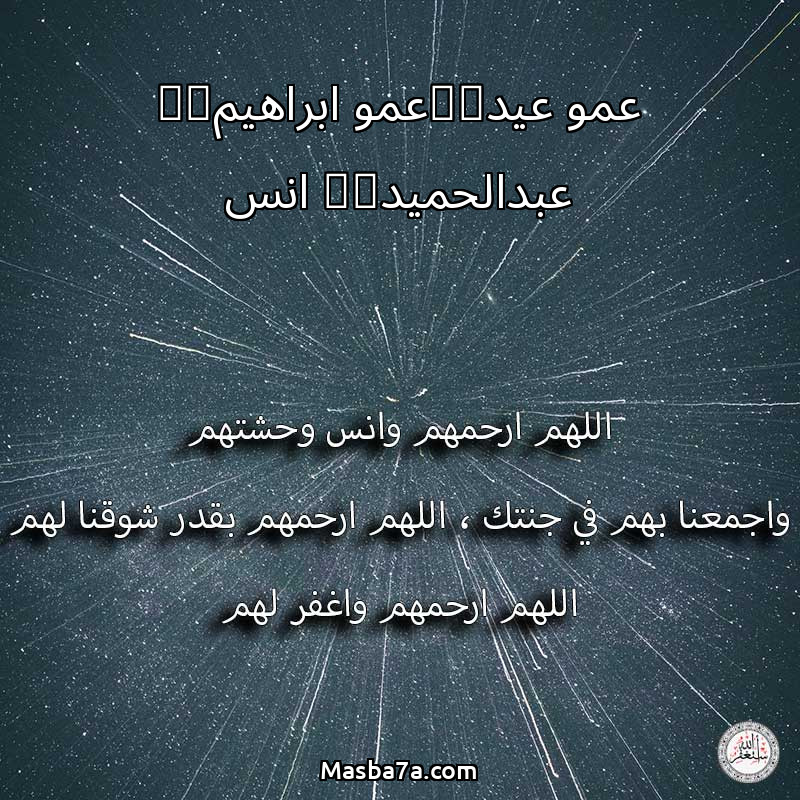 اللهم ارحم ( عمو عيد &عمو ابراهيم & عبدالحميد & انس ) وانس وحشتهم واجمعنا بهم في جنتك ، اللهم ارحمهم بقدر شوقنا لهم اللهم ارحمهم واغفر لهم.