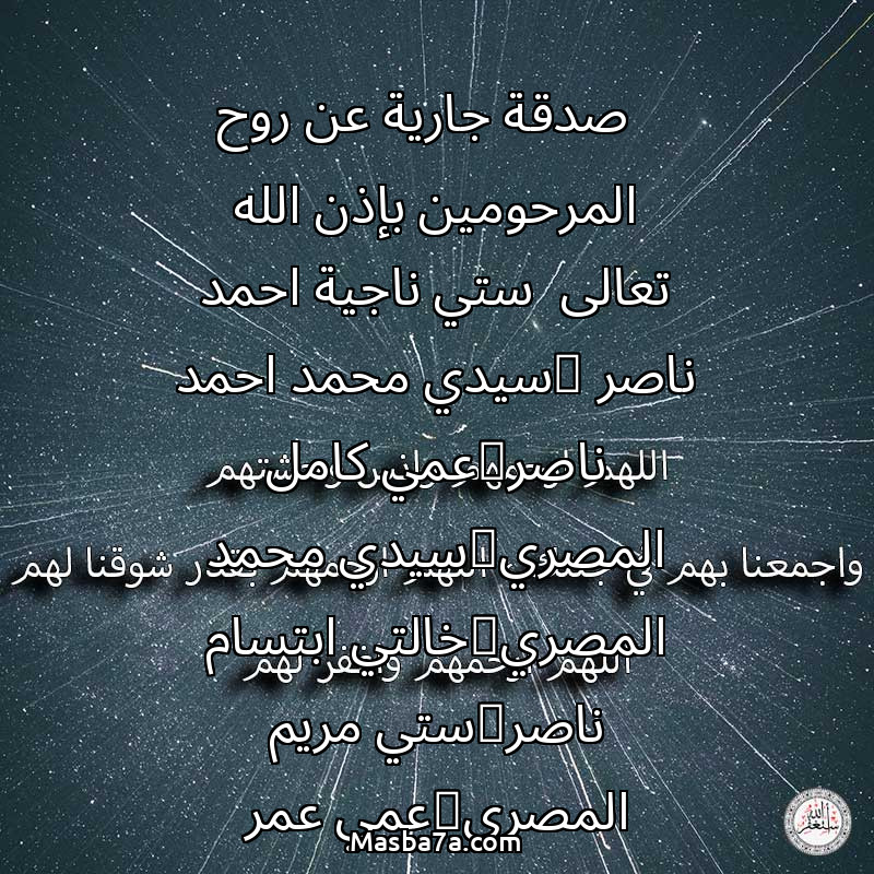 اللهم ارحم ( صدقة جارية عن روح المرحومين بإذن الله تعالى ستي ناجية احمد ناصر @سيدي محمد احمد ناصر@عمي كامل المصري@سيدي محمد المصري@خالتي ابتسام ناصر@ستي مريم المصري@عمي عمر المصري@عمتي خولة المصري @عمو ابو سامر إنا لله وإنا إليه راجعون إنَّ لله ما أخذ، وله ما أعطى ) وانس وحشتهم واجمعنا بهم في جنتك ، اللهم ارحمهم بقدر شوقنا لهم اللهم ارحمهم واغفر لهم.
