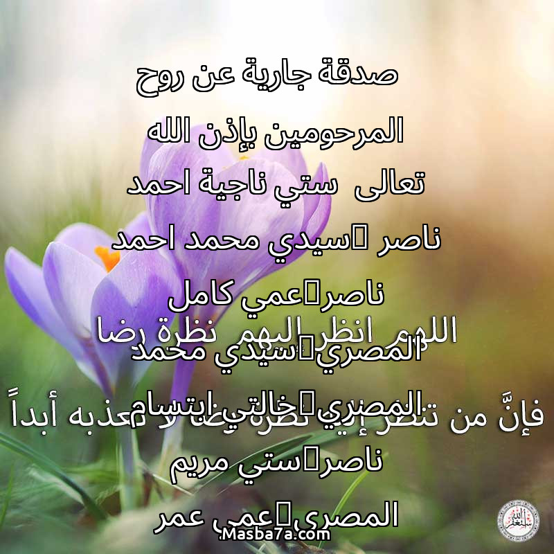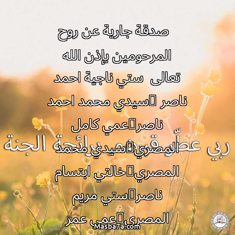 صدقة جارية عن روح المرحومين بإذن الله تعالى ستي ناجية احمد ناصر @سيدي محمد احمد ناصر@عمي كامل المصري@سيدي محمد المصري@خالتي ابتسام ناصر@ستي مريم المصري@عمي عمر المصري@عمتي خولة المصري @عمو ابو سامر إنا لله وإنا إليه راجعون إنَّ لله ما أخذ، وله ما أعطى