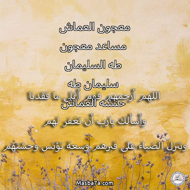 اللهم ارحم ( معجون العماش | مساعد معجون | طه السليمان | سليمان طه | حنشه العماش ) وانس وحشتهم واجمعنا بهم في جنتك ، اللهم ارحمهم بقدر شوقنا لهم اللهم ارحمهم واغفر لهم.