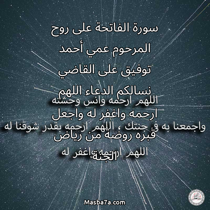 سورة الفاتحة على روح المرحوم عمي أحمد توفيق على القاضي نسالكم الدعاء اللهم ارحمه واغفر له واجعل قبره روضة من رياض الجنة