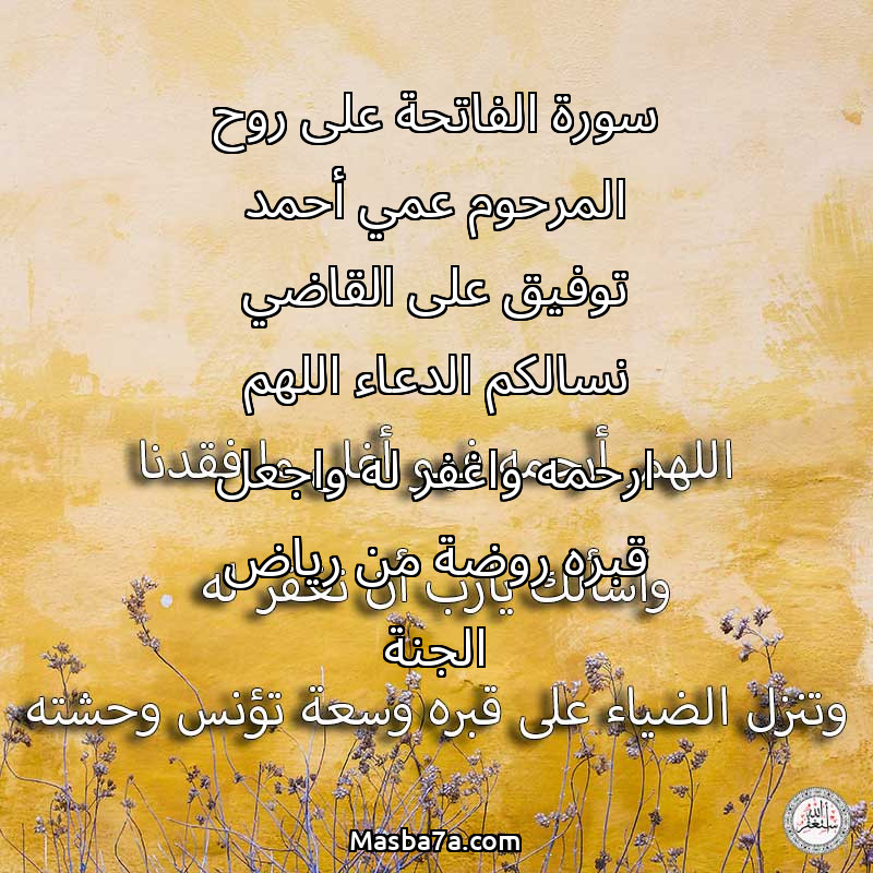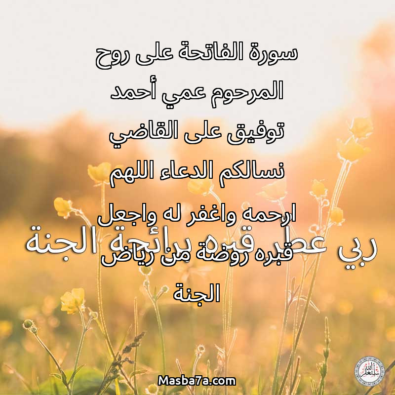 دعاء عن روح المرحوم سورة الفاتحة على روح المرحوم عمي أحمد توفيق على القاضي نسالكم الدعاء اللهم ارحمه واغفر له واجعل قبره روضة من رياض الجنة