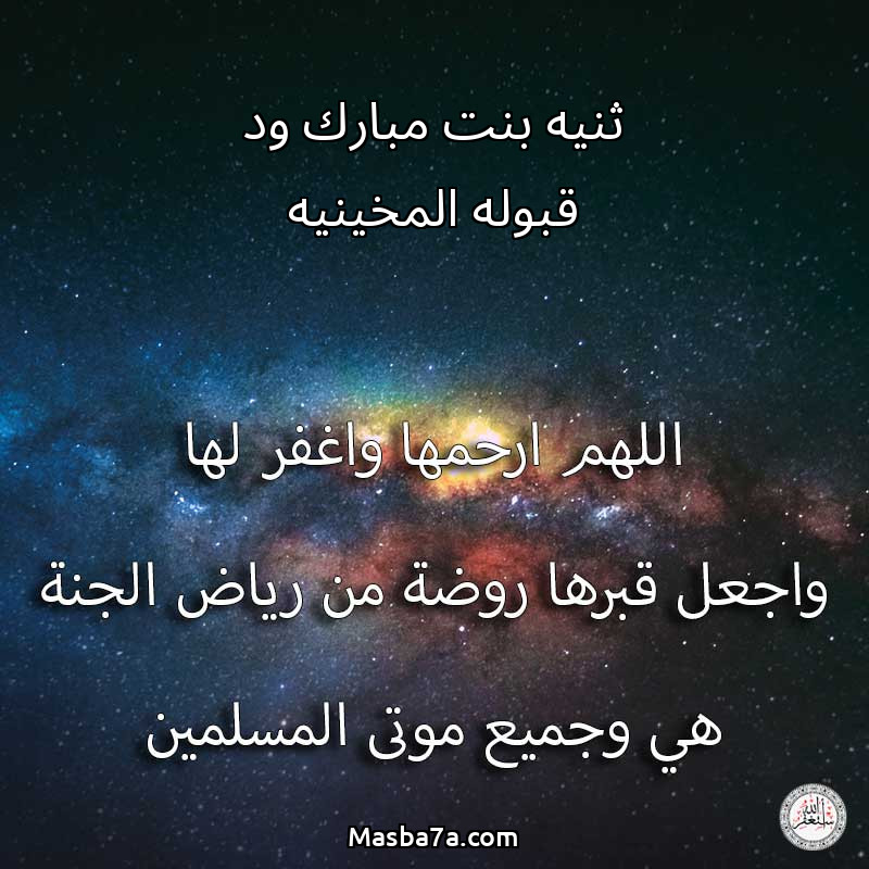 اللهم ارحم ( ثنيه بنت مبارك ود قبوله المخينيه ) وانس وحشتها واجمعنا بها في جنتك ، اللهم ارحمها بقدر شوقنا لها اللهم ارحمها واغفر لها .