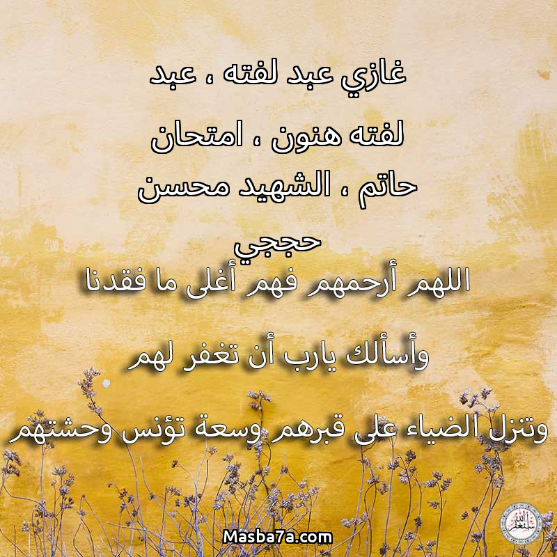 اللهم ارحم ( غازي عبد لفته ، عبد لفته هنون ، امتحان حاتم ، الشهيد محسن حججي ) وانس وحشتهم واجمعنا بهم في جنتك ، اللهم ارحمهم بقدر شوقنا لهم اللهم ارحمهم واغفر لهم.