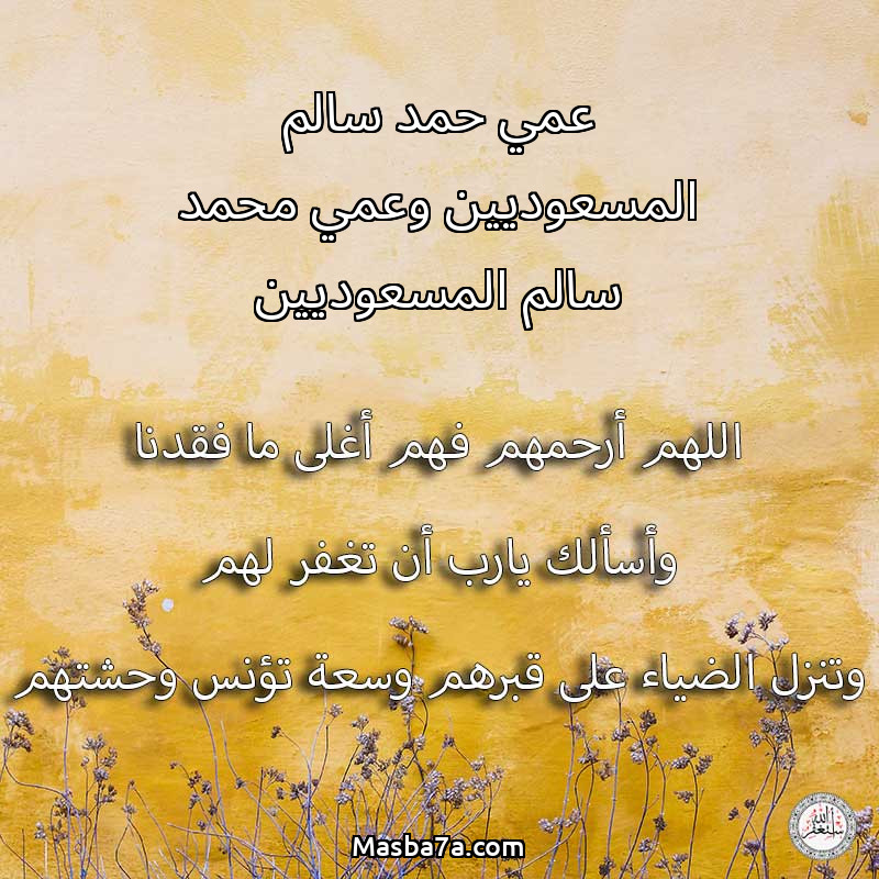 اللهم ارحم ( عمي حمد سالم المسعوديين وعمي محمد سالم المسعوديين ) وانس وحشتهم واجمعنا بهم في جنتك ، اللهم ارحمهم بقدر شوقنا لهم اللهم ارحمهم واغفر لهم.
