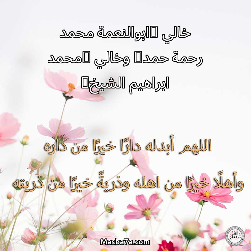 اللهم ارحم ( خالي (ابوالنعمة محمد رحمة حمد) وخالي (محمد ابراهيم الشيخ) ) وانس وحشته واجمعنا به في جنتك ، اللهم ارحمه بقدر شوقنا له اللهم ارحمه واغفر له .