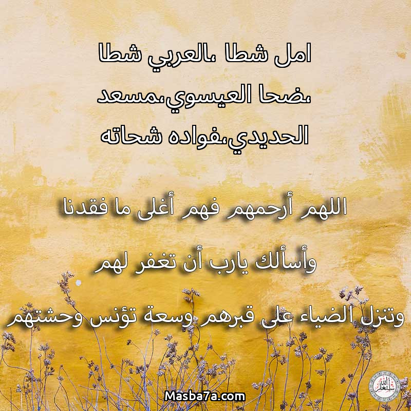اللهم ارحم ( امل شطا ،العربي شطا ،ضحا العيسوي،مسعد الحديدي،فواده شحاته ) وانس وحشتهم واجمعنا بهم في جنتك ، اللهم ارحمهم بقدر شوقنا لهم اللهم ارحمهم واغفر لهم.