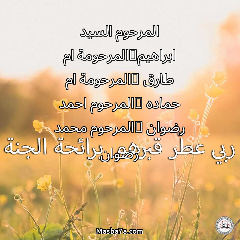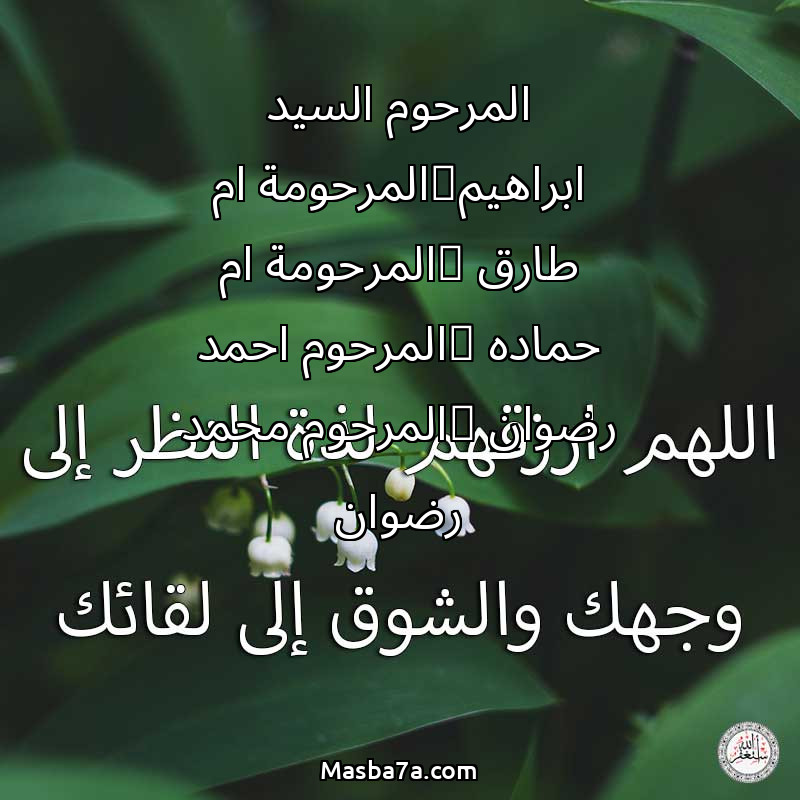 اللهم ارحم ( المرحوم السيد ابراهيم_المرحومة ام طارق _المرحومة ام حماده _المرحوم احمد رضوان _المرحوم محمد رضوان ) وانس وحشتهم واجمعنا بهم في جنتك ، اللهم ارحمهم بقدر شوقنا لهم اللهم ارحمهم واغفر لهم.