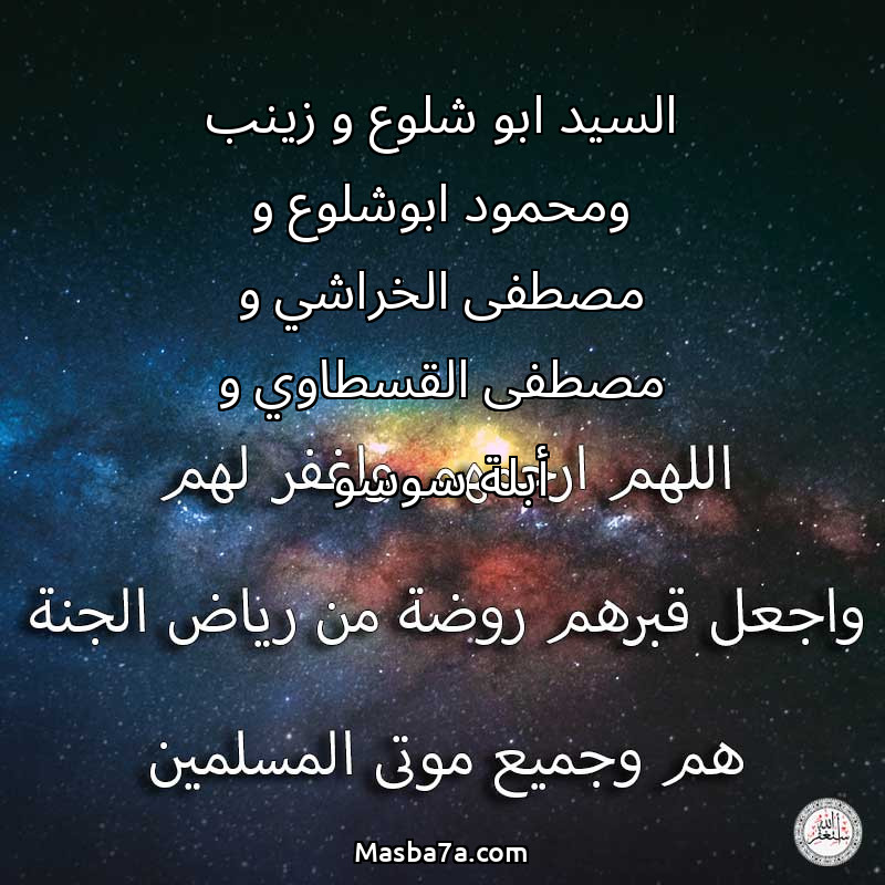 اللهم ارحم ( السيد ابو شلوع و زينب ومحمود ابوشلوع و مصطفى الخراشي و مصطفى القسطاوي و أبلة سوسو ) وانس وحشتهم واجمعنا بهم في جنتك ، اللهم ارحمهم بقدر شوقنا لهم اللهم ارحمهم واغفر لهم.