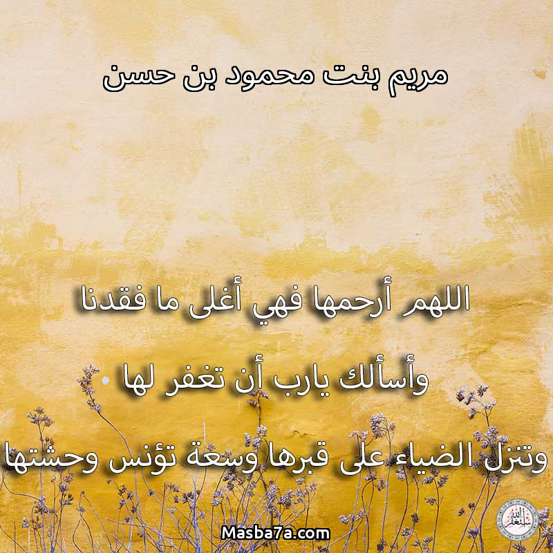 اللهم ارحم ( مريم بنت محمود بن حسن ) وانس وحشتها واجمعنا بها في جنتك ، اللهم ارحمها بقدر شوقنا لها اللهم ارحمها واغفر لها .