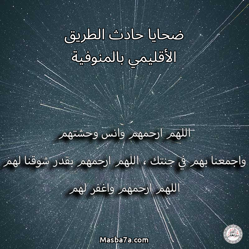 اللهم ارحم ( ضحايا حادث الطريق الأقليمي بالمنوفية ) وانس وحشتهم واجمعنا بهم في جنتك ، اللهم ارحمهم بقدر شوقنا لهم اللهم ارحمهم واغفر لهم.