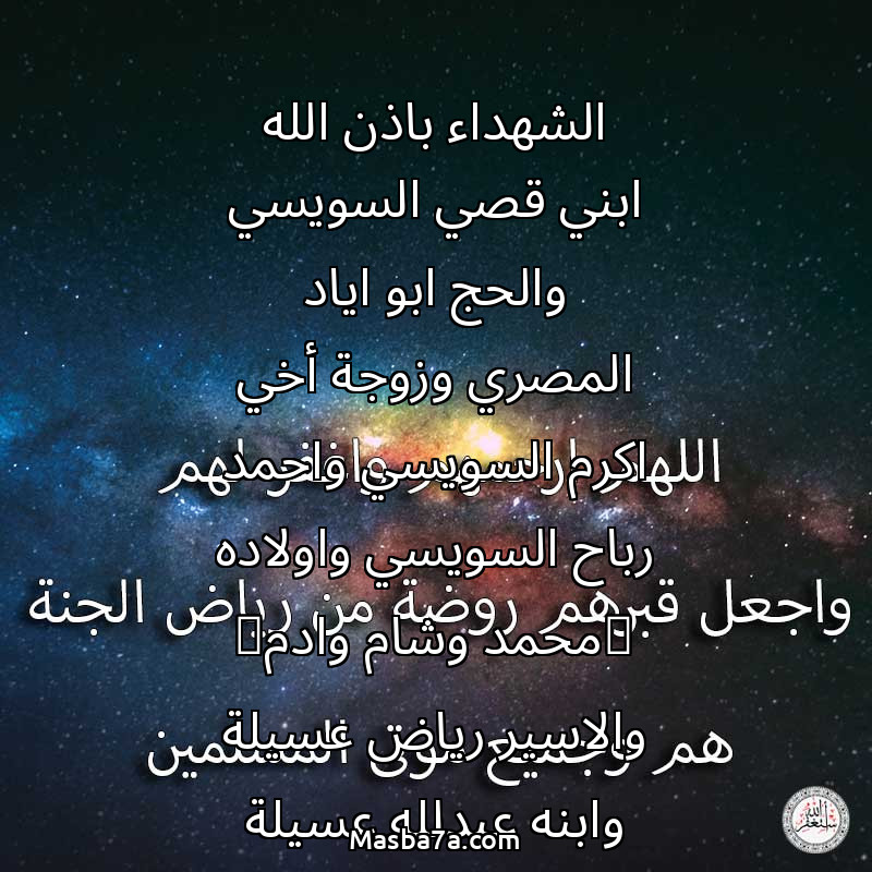 دعاء عن أرواح المرحومين الشهداء باذن الله ابني قصي السويسي والحج ابو اياد المصري وزوجة أخي اكرم السويسي واحمد رباح السويسي واولاده (محمد وشام وادم) والاسير رياض عسيلة وابنه عبدلله عسيلة