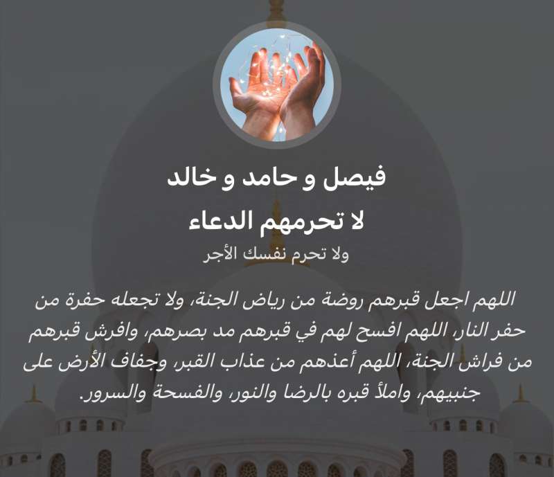 اللهم ارحم ( فيصل و حامد و خالد ) وانس وحشتهم واجمعنا بهم في جنتك ، اللهم ارحمهم بقدر شوقنا لهم اللهم ارحمهم واغفر لهم.