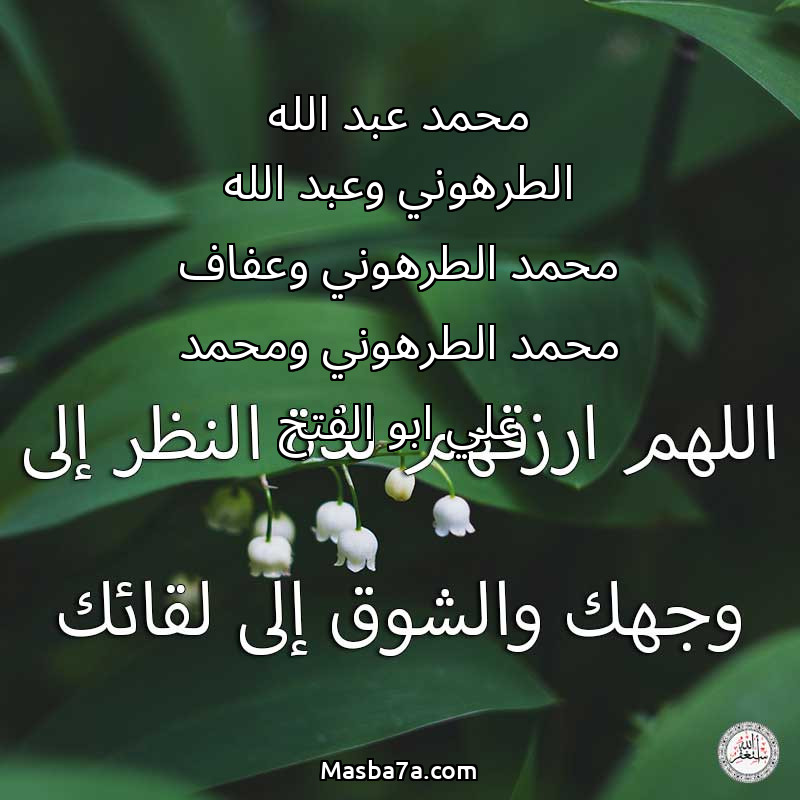 اللهم ارحم ( محمد عبد الله الطرهوني وعبد الله محمد الطرهوني وعفاف محمد الطرهوني ومحمد علي ابو الفتح ) وانس وحشتهم واجمعنا بهم في جنتك ، اللهم ارحمهم بقدر شوقنا لهم اللهم ارحمهم واغفر لهم.