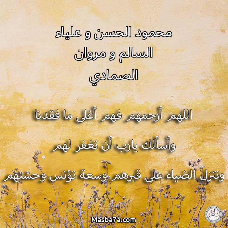 اللهم ارحم ( محمود الحسن و علياء السالم و مروان الصمادي ) وانس وحشتهم واجمعنا بهم في جنتك ، اللهم ارحمهم بقدر شوقنا لهم اللهم ارحمهم واغفر لهم.