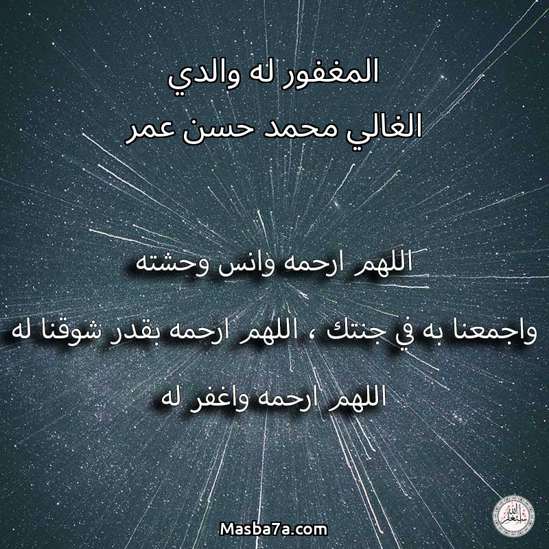 اللهم ارحم ( المغفور له والدي الغالي محمد حسن عمر ) وانس وحشته واجمعنا به في جنتك ، اللهم ارحمه بقدر شوقنا له اللهم ارحمه واغفر له .