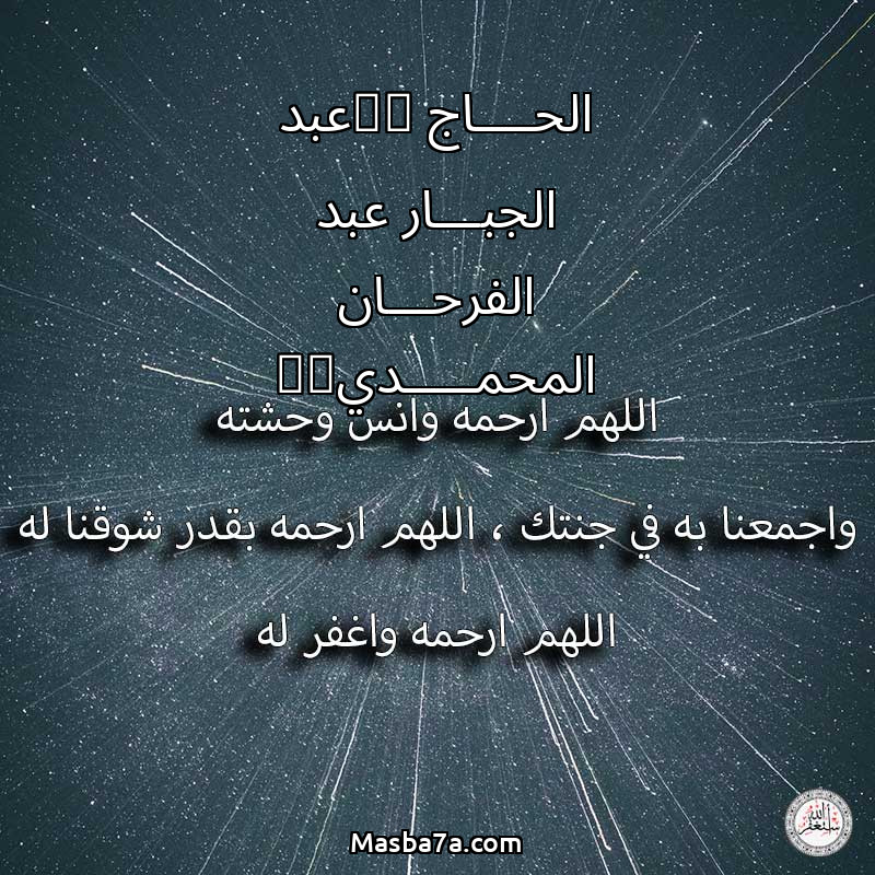 اللهم ارحم ( الحــــاج ((عبد الجبـــار عبد الفرحـــان المحمـــــدي)) ) وانس وحشته واجمعنا به في جنتك ، اللهم ارحمه بقدر شوقنا له اللهم ارحمه واغفر له .