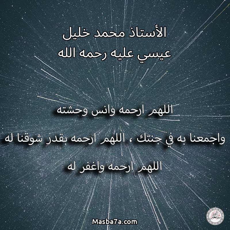 اللهم ارحم ( الأستاذ محمد خليل عيسي عليه رحمه الله ) وانس وحشته واجمعنا به في جنتك ، اللهم ارحمه بقدر شوقنا له اللهم ارحمه واغفر له .