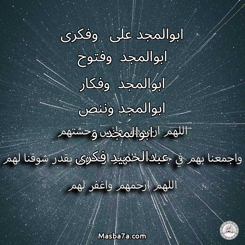 اللهم ارحم ( ابوالمجد على وفكرى ابوالمجد وفتوح ابوالمجد وفكار ابوالمجد وننص ابوالمجد و عبدالحميد فكرى ) وانس وحشتهم واجمعنا بهم في جنتك ، اللهم ارحمهم بقدر شوقنا لهم اللهم ارحمهم واغفر لهم.
