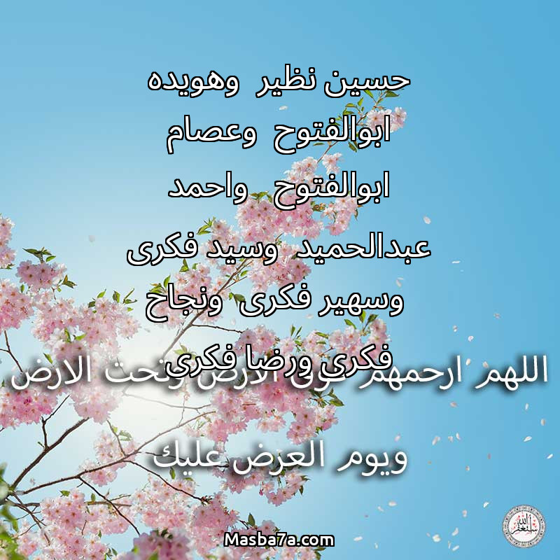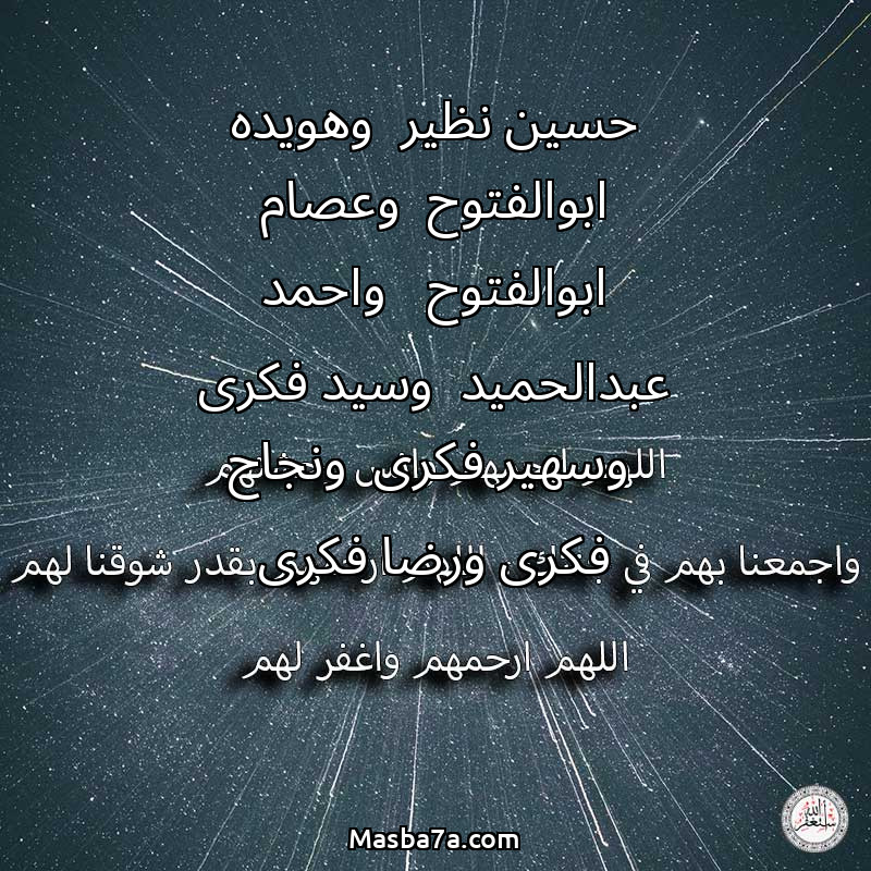 اللهم ارحم ( حسين نظير وهويده ابوالفتوح وعصام ابوالفتوح واحمد عبدالحميد وسيد فكرى وسهير فكرى ونجاح فكرى ورضا فكرى ) وانس وحشتهم واجمعنا بهم في جنتك ، اللهم ارحمهم بقدر شوقنا لهم اللهم ارحمهم واغفر لهم.