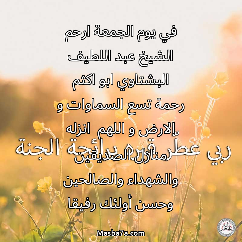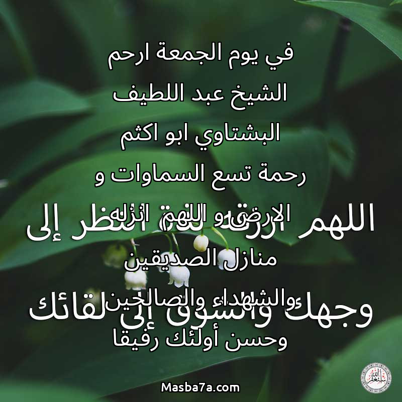 دعاء عن روح المرحوم في يوم الجمعة ارحم الشيخ عبد اللطيف البشتاوي ابو اكثم رحمة تسع السماوات و الارض و اللهم انزله منازل الصديقين والشهداء والصالحين وحسن أولئك رفيقا
