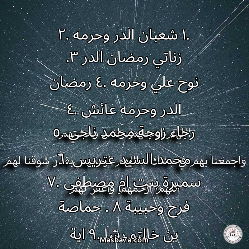 سورة يس عن أرواح 1. شعبان الدر وحرمه 2. زناتي رمضان الدر .3 نوح علي وحرمه 4. رمضان الدر وحرمه عائش 4. رجاء زوجة محمد ناجي 5. محمد السيد عتريس 6. سميرة بنت ام مصطفى 7. فرح وحبيبة . 8 حماصة بن خالتو رشا 9. اية احمد أبو زينة 10. شعبان عجور 11. محمد ابو الدهب 12. محمد الرهيوي 13.