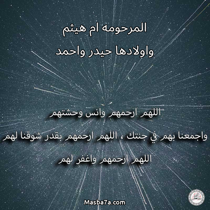 اللهم ارحم ( المرحومه ام هيثم واولادها حيدر واحمد ) وانس وحشتهم واجمعنا بهم في جنتك ، اللهم ارحمهم بقدر شوقنا لهم اللهم ارحمهم واغفر لهم.