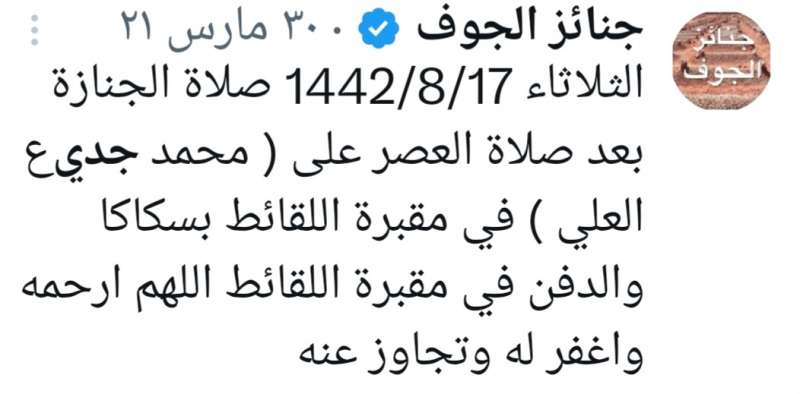 اللهم ارحم ( محمد عيسى جديع العلي ) وانس وحشته واجمعنا به في جنتك ، اللهم ارحمه بقدر شوقنا له اللهم ارحمه واغفر له .