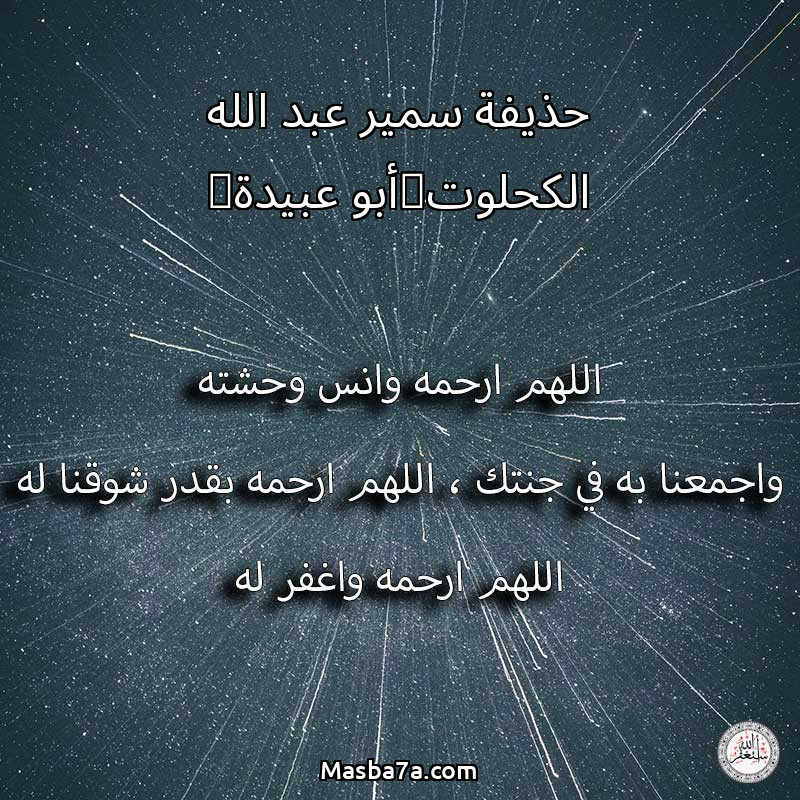 اللهم ارحم ( حذيفة سمير عبد الله الكحلوت(أبو عبيدة) ) وانس وحشته واجمعنا به في جنتك ، اللهم ارحمه بقدر شوقنا له اللهم ارحمه واغفر له .