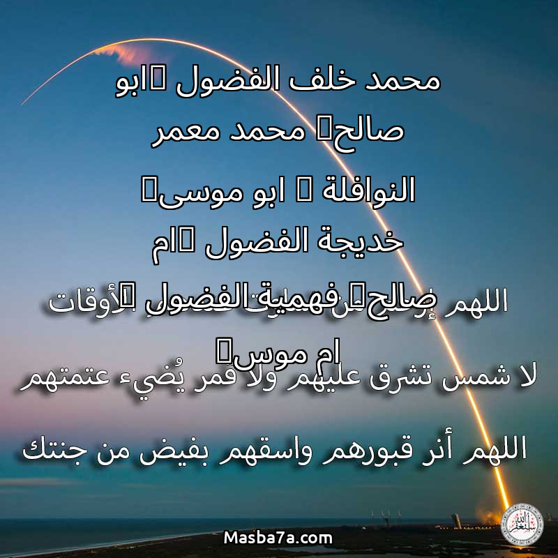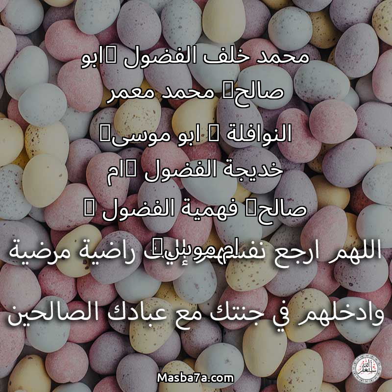 اللهم ارحم ( محمد خلف الفضول (ابو صالح) محمد معمر النوافلة ( ابو موسى) خديجة الفضول (ام صالح) فهمية الفضول ( ام موس) ) وانس وحشتهم واجمعنا بهم في جنتك ، اللهم ارحمهم بقدر شوقنا لهم اللهم ارحمهم واغفر لهم.