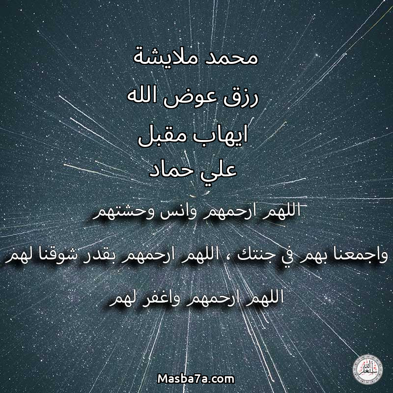 اللهم ارحم ( محمد ملايشة | رزق عوض الله | ايهاب مقبل | علي حماد ) وانس وحشتهم واجمعنا بهم في جنتك ، اللهم ارحمهم بقدر شوقنا لهم اللهم ارحمهم واغفر لهم.