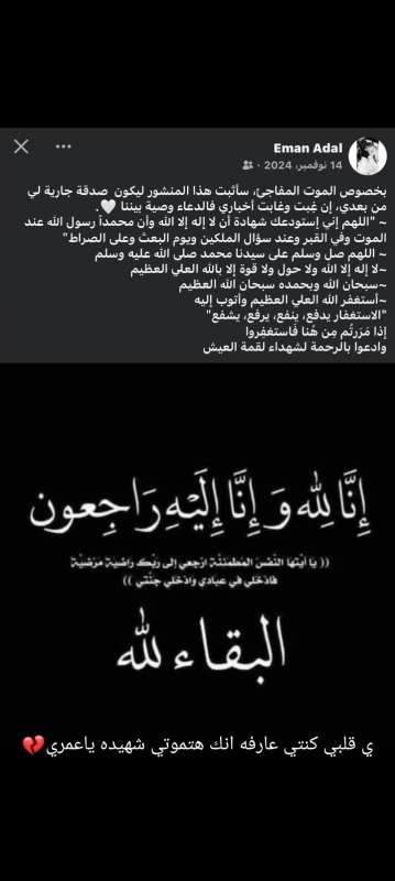 اللهم ارحم ( ايمان عادل ) وانس وحشتها واجمعنا بها في جنتك ، اللهم ارحمها بقدر شوقنا لها اللهم ارحمها واغفر لها .