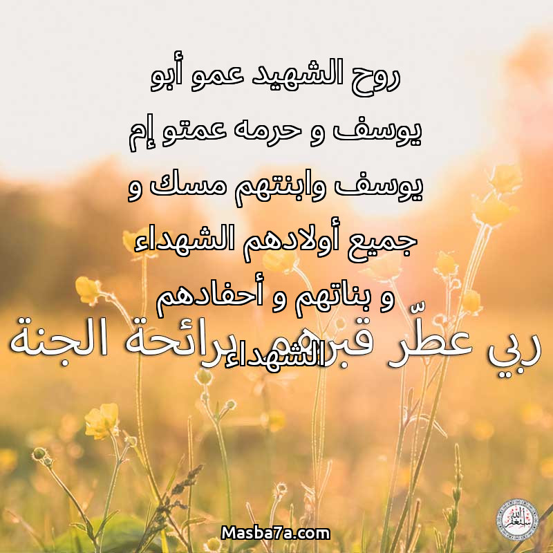 دعاء عن أرواح المرحومين روح الشهيد عمو أبو يوسف و حرمه عمتو إم يوسف وابنتهم مسك و جميع أولادهم الشهداء و بناتهم و أحفادهم الشهداء