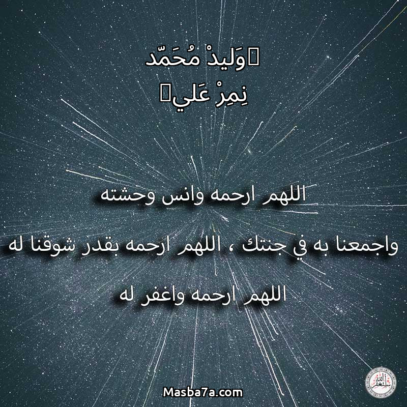 اللهم ارحم ( (وَليدْ مُحَمّد نِمِرْ عَلي) ) وانس وحشته واجمعنا به في جنتك ، اللهم ارحمه بقدر شوقنا له اللهم ارحمه واغفر له .