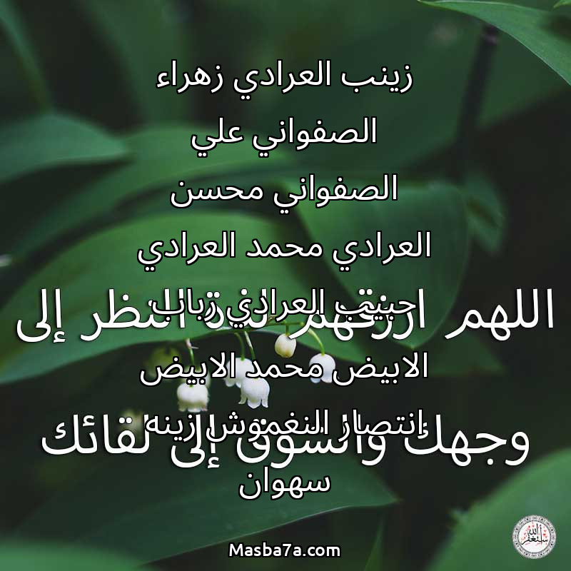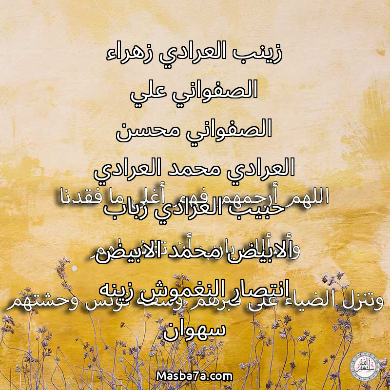 دعاء عن أرواح المرحومين زينب العرادي زهراء الصفواني علي الصفواني محسن العرادي محمد العرادي حبيب العرادي رباب الابيض محمد الابيض انتصار النغموش زينه سهوان