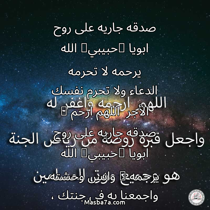 دعاء عن روح المرحوم صدقه جاريه على روح ابويا (حبيبي) الله يرحمه لا تحرمه الدعاء ولا تحرم نفسك الأجر اللهم ارحم ( صدقه جاريه على روح ابويا (حبيبي) الله يرحمه ) وانس وحشته واجمعنا به في جنتك ، اللهم ارحمه بقدر شوقنا له اللهم ارحمه واغفر له . اللهم إرحم من تساوت عندهم الأوقات لا شمس تشرق عليهم ولا قمر يُضيء عتمتهم اللهم أنر قبورهم واسقهم بفيض من جنتك .