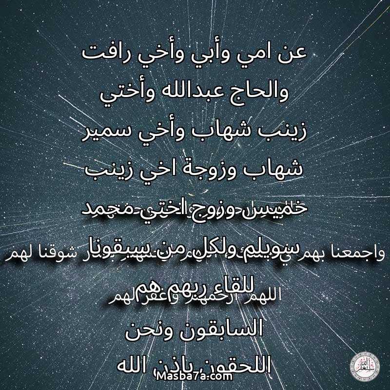 اللهم ارحم ( عن امي وأبي وأخي رافت والحاج عبدالله وأختي زينب شهاب وأخي سمير شهاب وزوجة اخي زينب خميس وزوج اختي محمد سويلم ولكل من سبقونا للقاء ربهم هم السابقون ونحن اللحقون بإذن الله ) وانس وحشتهم واجمعنا بهم في جنتك ، اللهم ارحمهم بقدر شوقنا لهم اللهم ارحمهم واغفر لهم.
