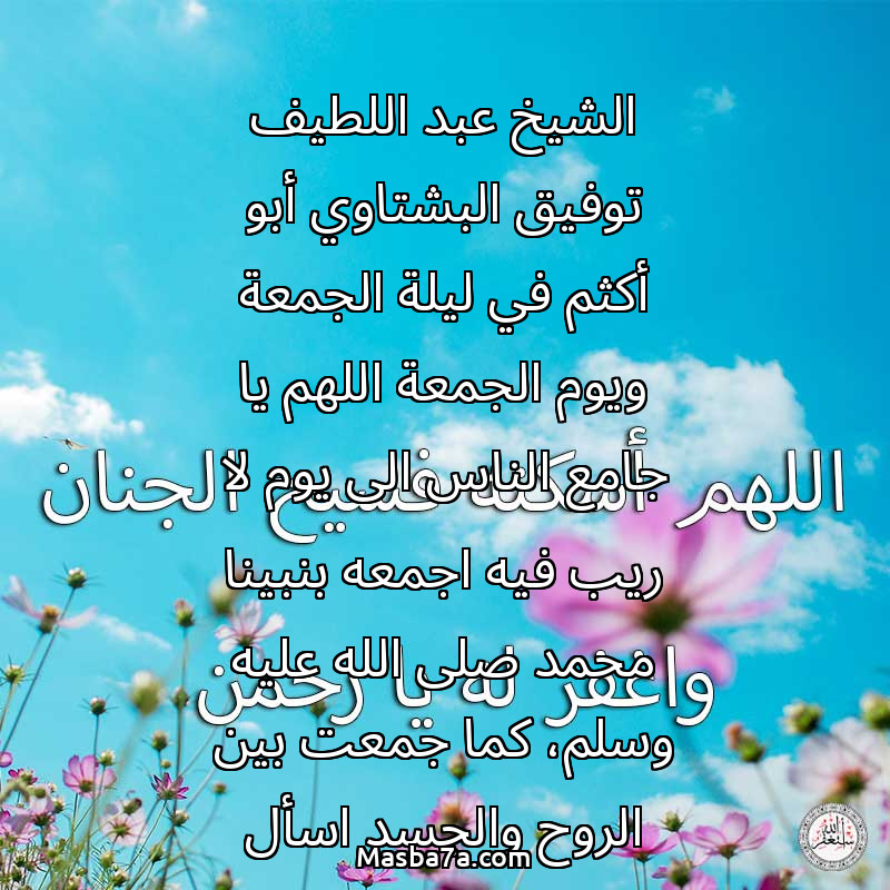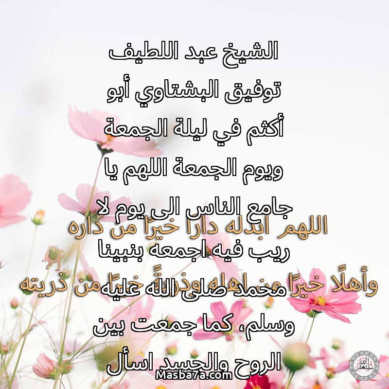 الشيخ عبد اللطيف توفيق البشتاوي أبو أكثم في ليلة الجمعة ويوم الجمعة اللهم يا جامع الناس الى يوم لا ريب فيه اجمعه بنبينا محمد صلى الله عليه وسلم، كما جمعت بين الروح والجسد اسأل الله العظيم رب العرش العظيم ان يأخذ بيده اللهم احرسه بعينيك التى لا تنام واكفه بركنك الذى لا يرام واحفظه بعزك الذى لا يضام وارحمه بقدرتك اللهم اجعل قبره روضة من رياض اللهم امين يارب العالمين
