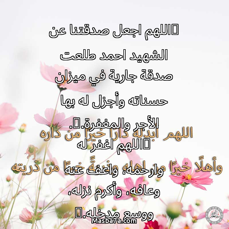 "اللهم اجعل صدقتنا عن الشهيد احمد طلعت صدقة جارية في ميزان حسناته وأجزل له بها الأجر والمغفرة.". "اللهم اغفر له وارحمه، واعف عنه وعافه، وأكرم نزله، ووسع مدخله."