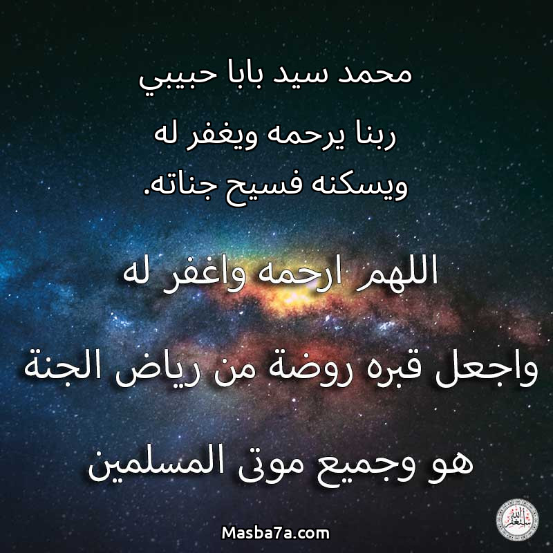 اللهم ارحم ( محمد سيد بابا حبيبي ربنا يرحمه ويغفر له ويسكنه فسيح جناته. ) وانس وحشته واجمعنا به في جنتك ، اللهم ارحمه بقدر شوقنا له اللهم ارحمه واغفر له .