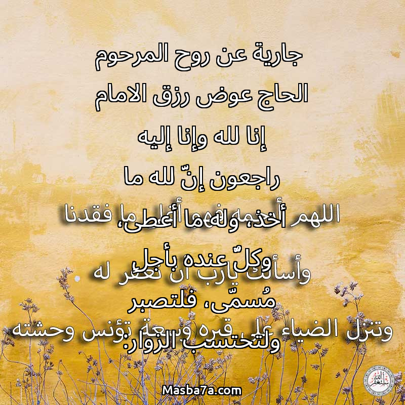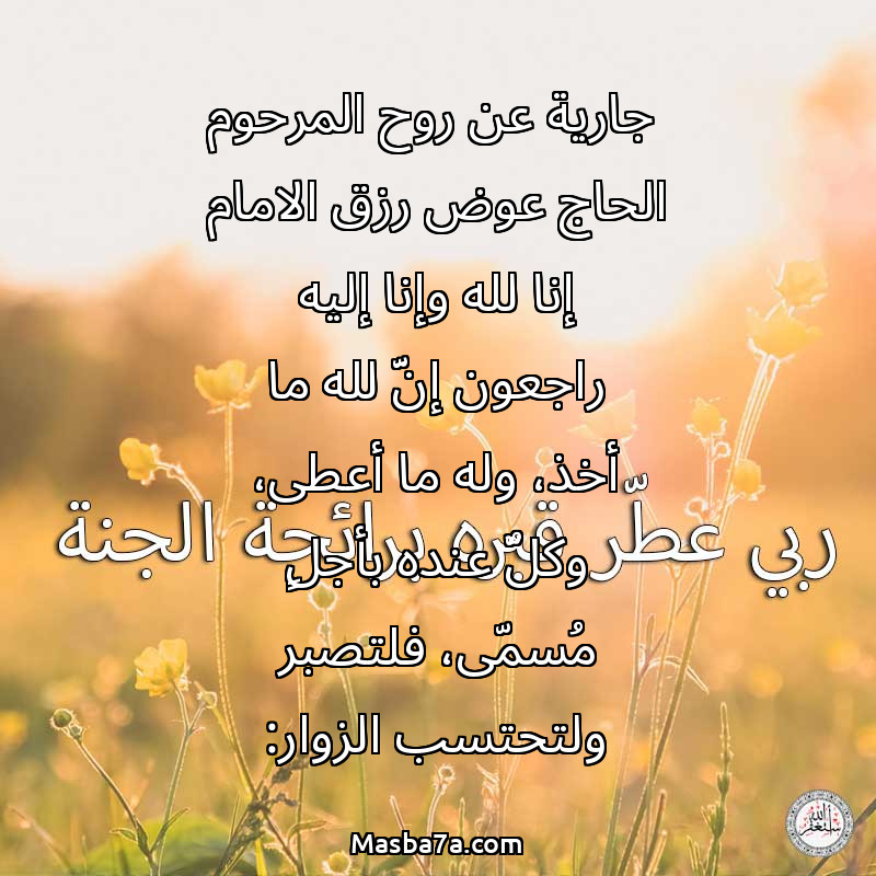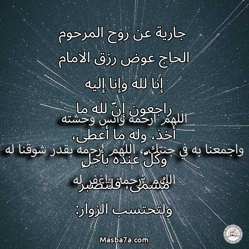 جارية عن روح المرحوم الحاج عوض رزق الامام إنا لله وإنا إليه راجعون إنَّ لله ما أخذ، وله ما أعطى، وكلٌّ عنده بأجلٍ مُسمّى، فلتصبر ولتحتسب الزوار: