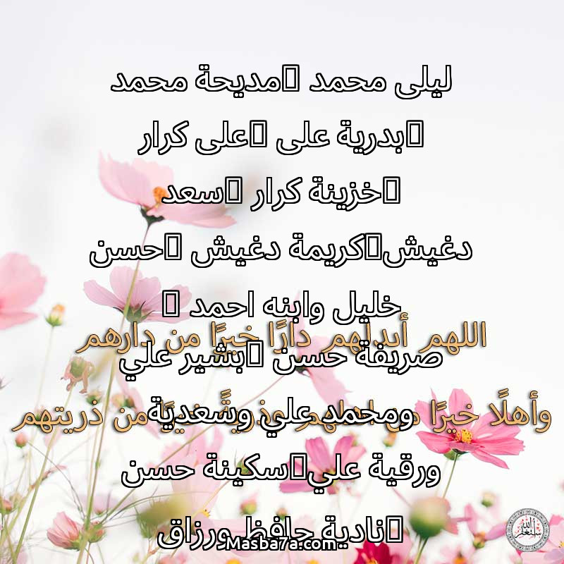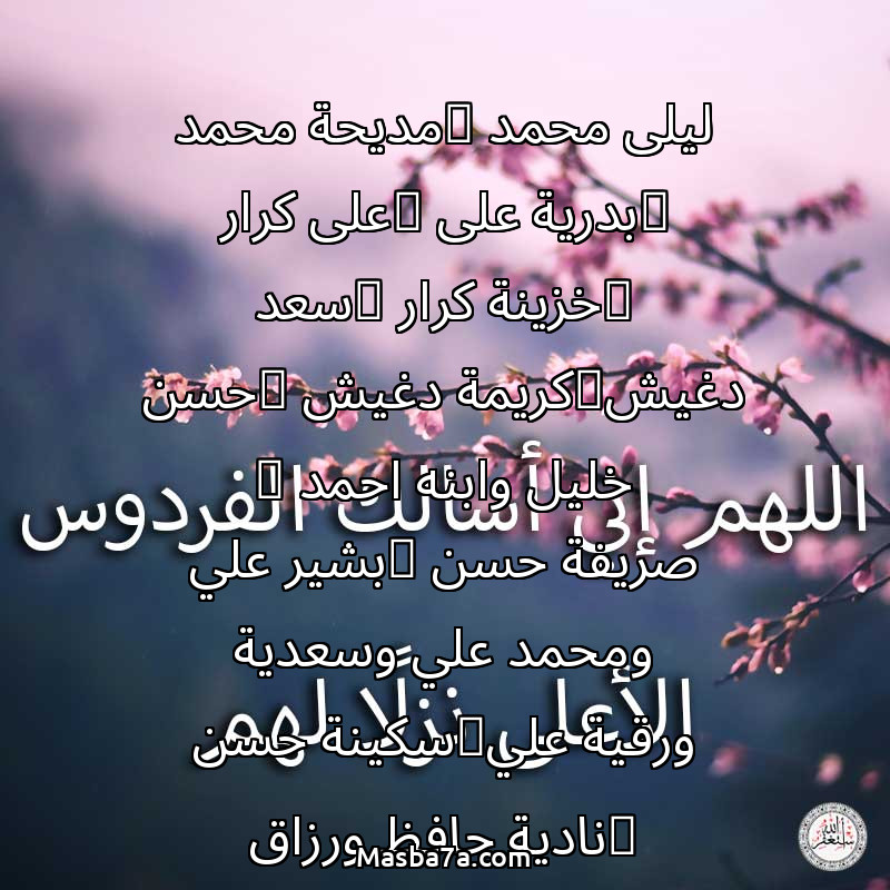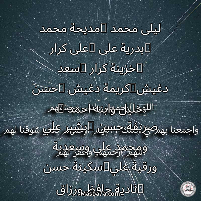 اللهم ارحم ( ليلى محمد _مديحة محمد _بدرية على _على كرار _خزينة كرار _سعد دغيش_كريمة دغيش _حسن خليل وابنه احمد _ صريفة حسن _بشير علي ومحمد علي وسعدية ورقية علي_سكينة حسن _نادية حافظ ورزاق وسهير وامل كريم_جمالات وعامرية_عائشة عبد الغني وخالد وتاج _عبده وسعد الدين_محمد كرار _عواض بحر_محمد حسن وزينب فتاح _فتحي محمد _فتحية صديق_زوبة وعطا وايمان _رضا ابوزيت_كريمة شكري _ أنيسة بحر _ بكرى شحات _فاروق عابدين__فوزية وسامي _عم شعبان _جميع موتنا والمسلمين ) وانس وحشتهم واجمعنا بهم في جنتك ، اللهم ارحمهم بقدر شوقنا لهم اللهم ارحمهم واغفر لهم.