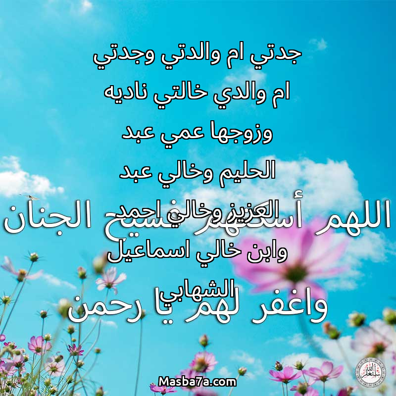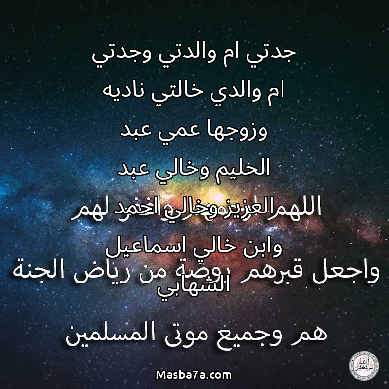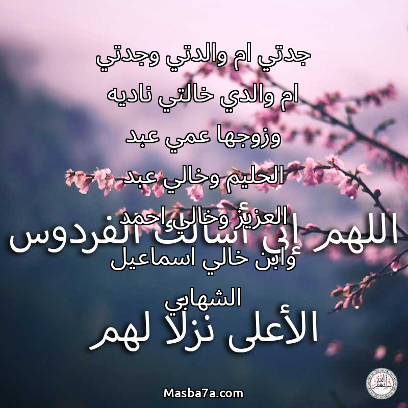 دعاء عن أرواح المرحومين جدتي ام والدتي وجدتي ام والدي خالتي ناديه وزوجها عمي عبد الحليم وخالي عبد العزيز وخالي احمد وابن خالي اسماعيل الشهابي