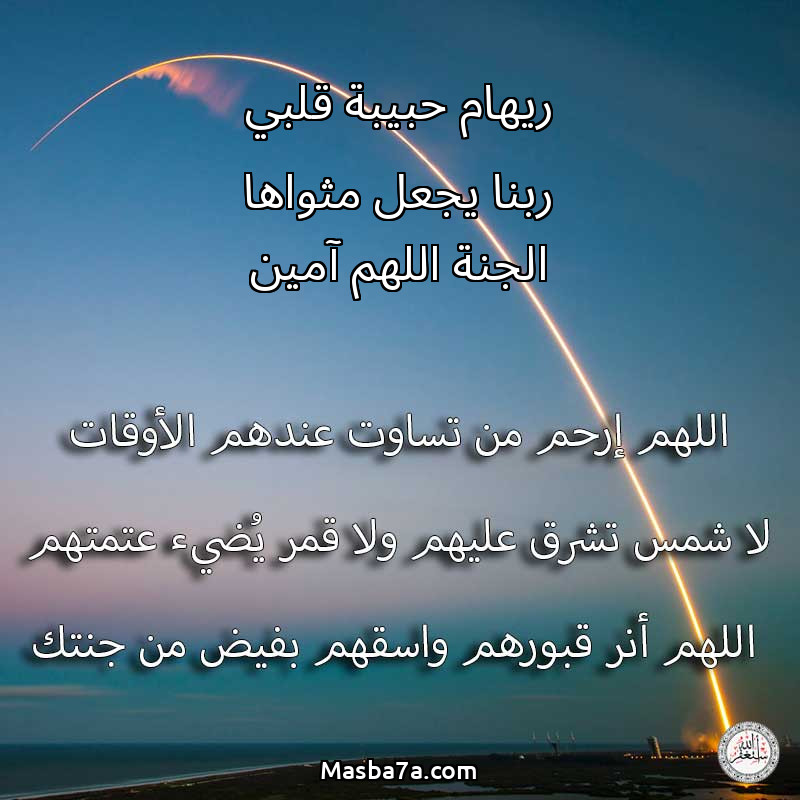 اللهم ارحم ( ريهام حبيبة قلبي ربنا يجعل مثواها الجنة اللهم آمين ) وانس وحشتها واجمعنا بها في جنتك ، اللهم ارحمها بقدر شوقنا لها اللهم ارحمها واغفر لها .