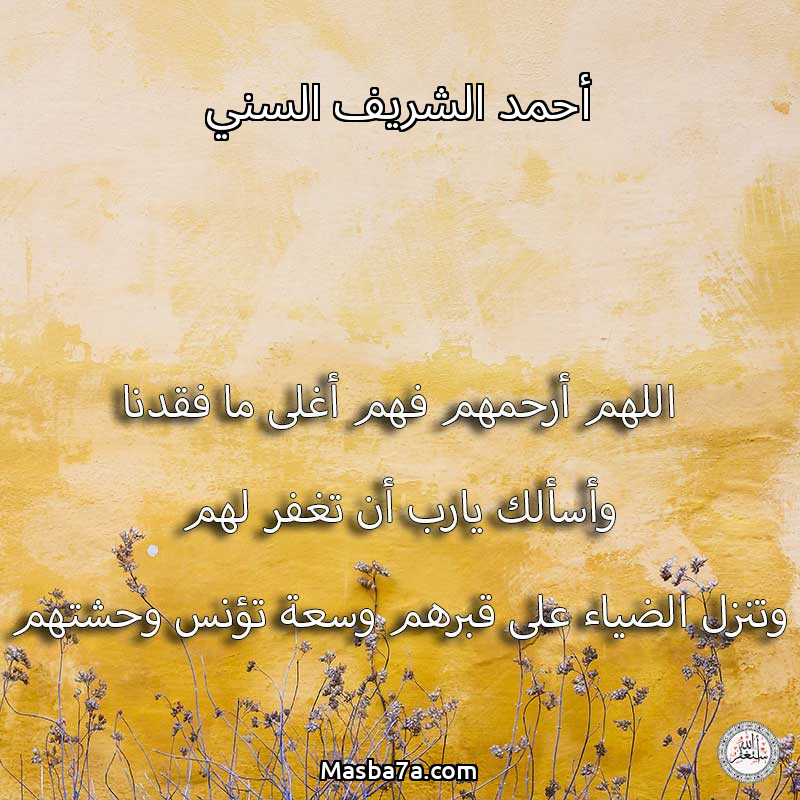 اللهم ارحم ( أحمد الشريف السني/ عائشة أحمد السني/ رانيا علي الفحيل/ عائشة نور الدين الشابي ) وانس وحشتهم واجمعنا بهم في جنتك ، اللهم ارحمهم بقدر شوقنا لهم اللهم ارحمهم واغفر لهم.
