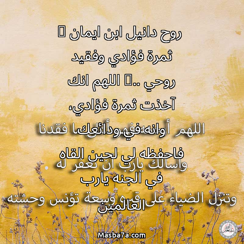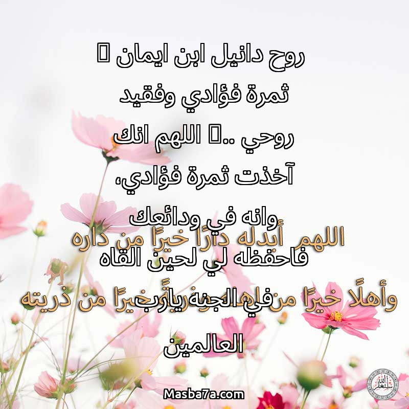 دعاء عن روح المرحوم روح دانيل ابن ايمان ( ثمرة فؤادي وفقيد روحي ).. اللهم انك آخذت ثمرة فؤادي، وانه في ودائعك فاحفظه لي لحين القاه في الجنه يارب العالمين